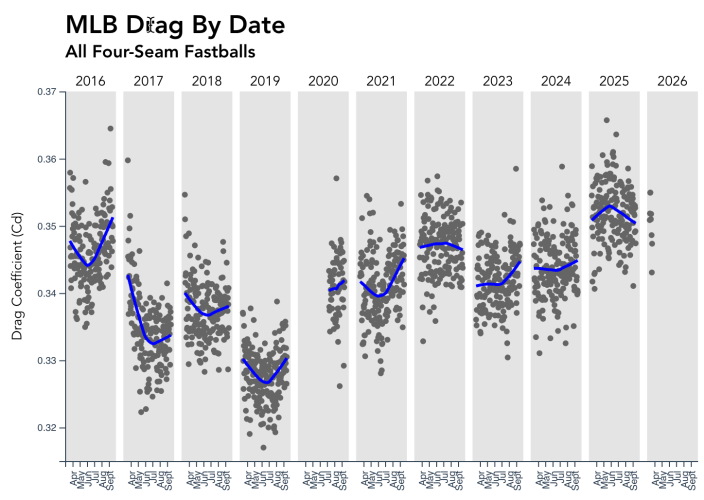 It is not hard to understand why we're seeing slow early returns on home runs, because the drag on the baseball is very much in line with last year as well as that sluggish 2022 season:
