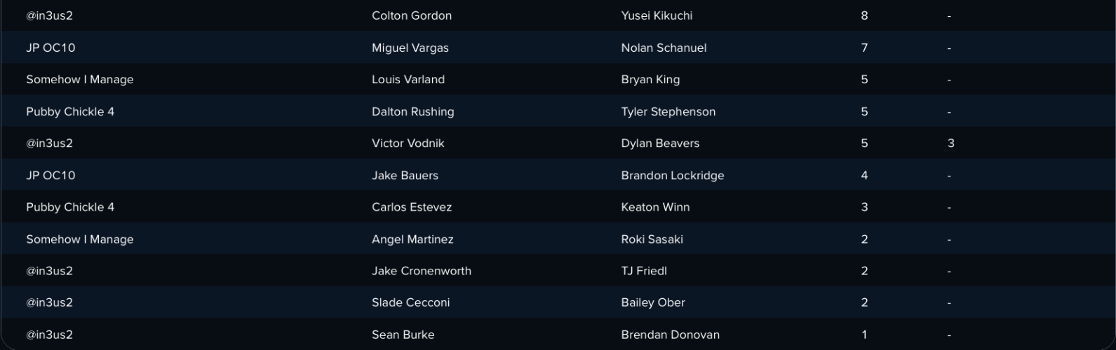 My Drops: Jacob Lopez, Colton Cowser. What is with so many of the Orioles' hitting prospects stagnating so much? Cowser was one of my favorite OF5 targets, with the thought being that he'd be a good bounceback candidate, with the ability to provide both cheap power and speed. Zero homers and zero stolen bases with a .174 batting average later, it's time to say good-bye in 12-team leagues.