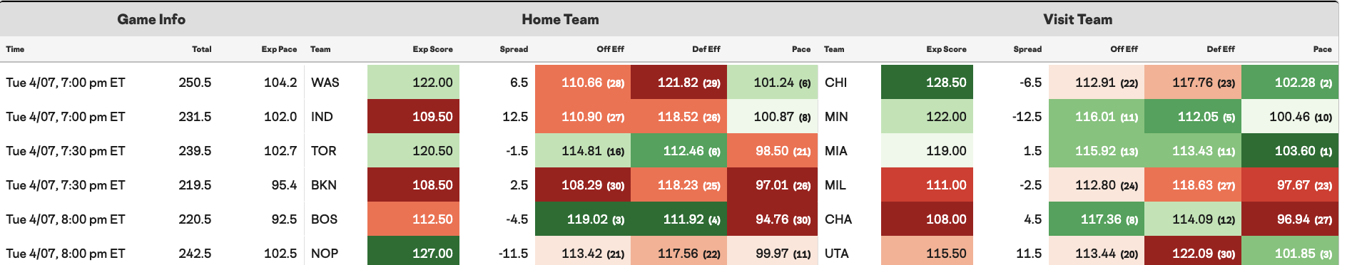 Although high projected totals from CHI/WAS, UTA/NOP and MIA/TOR should turn heads, I don't think there's much use for the Vegas numbers tonight. We're targeting specific teams with special circumstances, with little attention paid to pace. We want production from teams like Charlotte, Miami and Toronto with a lot to play for, and value from teams like Milwaukee, Utah, Washington, Brooklyn and Indiana, who are all emptying their benches as the season draws to a close.