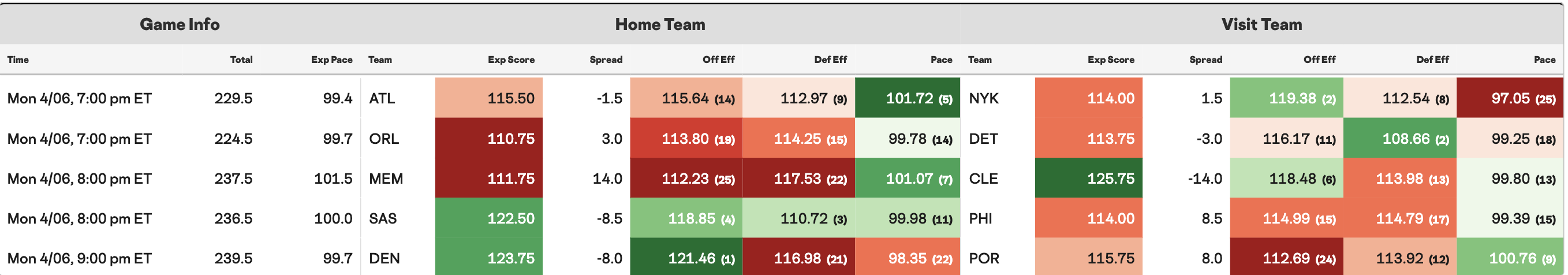 The POR/DEN game wins the race for the top projected total tonight, and we've populated our selections with options for both teams. Cleveland enters the tail-end of a back-to-back set against Memphis with a race for the third seed in effect against the Knicks, and the weirdness occurring with Memphis' lineup should yield some value when we get word on the starting five.