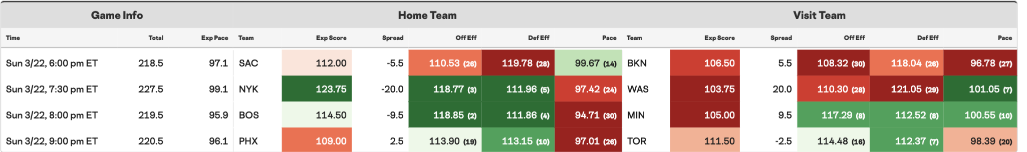 As you'll see below, there are a couple of questionable spots requiring attention prior to tipoff. Though the Knicks are 20-point favorites, I'm still going with their elites in the hopes of getting three good quarters out of the starters. The basement battle between Sacramento and Brooklyn lists a pitiful projected total, yet I identified some potential value there. My favorite team is Toronto going up against the injury-riddled Suns.