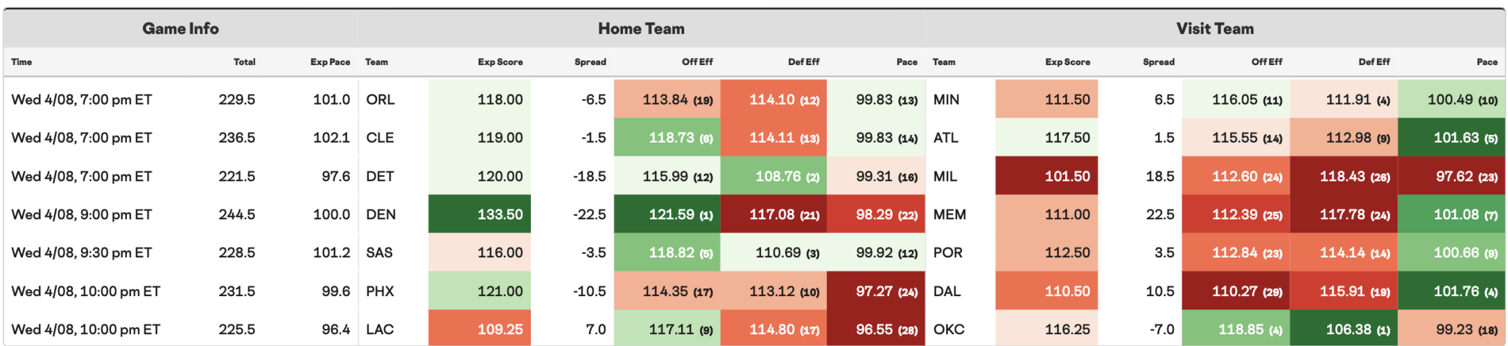 The MEM/DEN matchup holds the highest projected total, and while some of Memphis' budget pivots didn't make my list, you can certainly find some value there. I'm a fan of ATL/CLE and OKC/LAC. They should be the most watchable games, and there's ample DFS action to target in both contests.