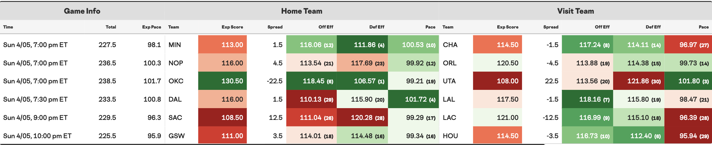 We have three matchups projecting totals over 230, and I think NOP/ORL offers the best DFS productivity among that group. Some Pelicans fell just outside my list, but feel free to further examine that roster. I pressed the brakes on the Thunder despite a tight race with the Spurs down the stretch. I think they'll only need three quarters from the starters. And while they'll all perform well, the chance for upside could be much lower.