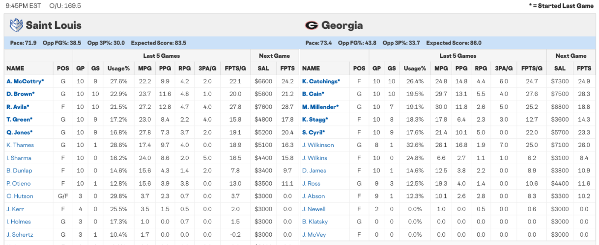 Next up, our Advanced College Basketball Lineups page is a resource that's second to none. Here, you'll be able to view recent starters for each team in the player pool alongside salaries, with stats like minutes, usage and fantasy PPG included. It's perfect for researching the lesser-known mid-majors and gathering recent trends. You can also click on any team logo to navigate to a team-specific page, which shows usage from last year among other stats. Here's one for Georgia-Saint Louis, which has one of the tighter spreads among the projected high-scoring games: