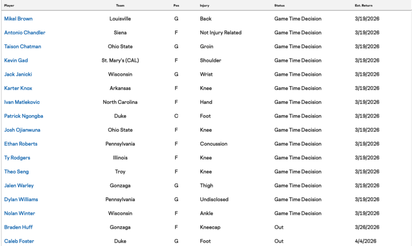 My colleague Ryan Andrade also has a more in-depth breakdowndown of March Madness injuries, with additional context, what these players mean to their teams, and a prediction of their likelihood of actually suiting up in the opening round. Super valuable piece that's 100 percent free.