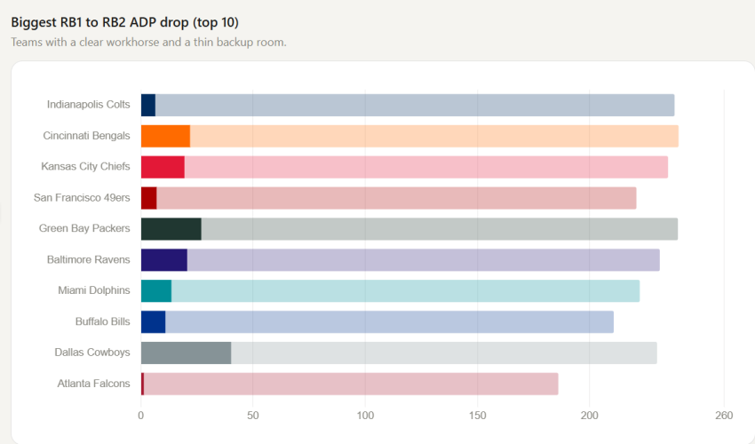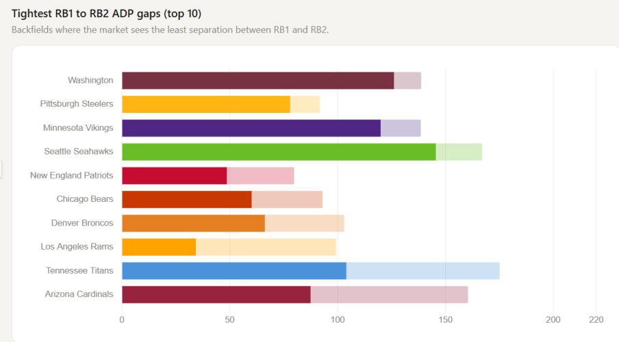 This chart paints a pretty intuitive picture that underscores how strong a hold the league's workhorses have on their collective backfields. Every RB1 on this chart is backed up by an RB2 with an ADP north of 200, save for Bijan Robinson and his backup, Brian Robinson.