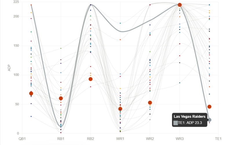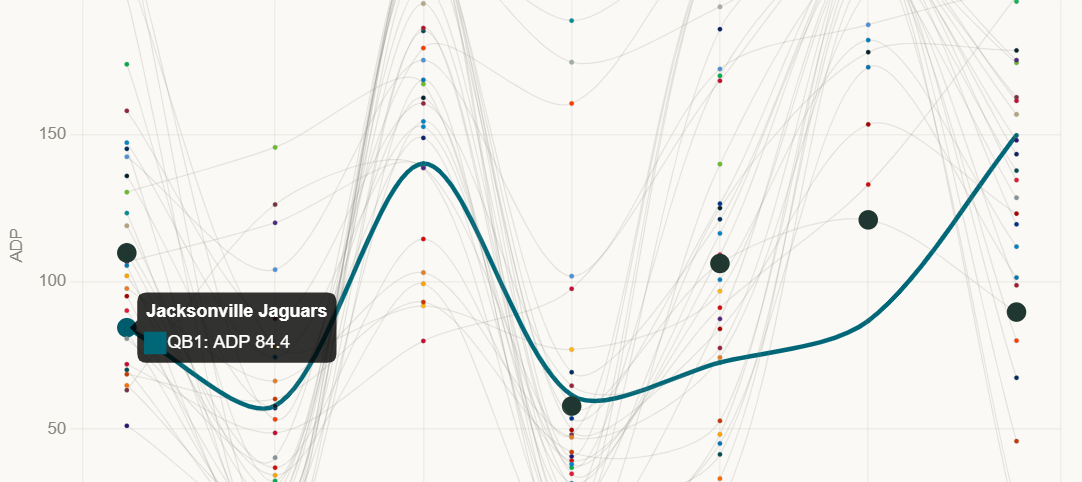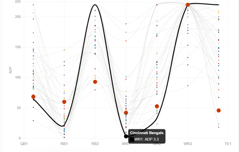 You can hover over each line to see every individual team's ADP shape. It can be an insightful look into how the market views a given offense. Basically, it's a way of seeing what type of story the market is telling about each team. For example, if there's a team with two receivers going in the first 40 picks but the quarterback is going outside the top 100 picks, the market might be underselling that quarterback or overrating one of those two wideouts.