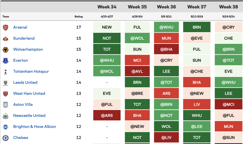Here are the best FPL teams to target based on the upcoming GW34-GW38 fixture run: