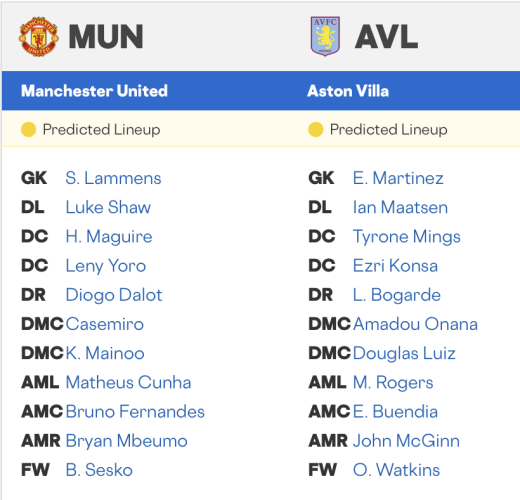 Any successful game plan versus Aston Villa is predicated upon slowing the progress of their star attacker, Morgan Rogers. With Rogers likely to lineup on Villa's attacking left, United's Diogo Dalot is likely to draw the difficult marking assignment. Rogers has rattled off 17 shots (four on goal) across six appearances (six starts) in all competitions since he last found the back of the net. Expect Dalot to receive assistance from the United midfield or attackers tracking back as he seeks to keep Rogers from cutting inside on his favorite right foot.